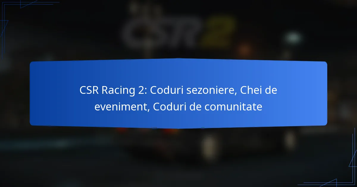 Codurile comunității sunt șiruri alfanumerice pe care jucătorii le pot introduce în CSR Racing 2 pentru a primi recompense. Aceste coduri sunt de obicei împărtășite în cadrul comunității jocului, inclusiv pe forumuri și platforme de social media. Scopul principal al acestor coduri este de a încuraja implicarea comunității și de a oferi jucătorilor stimulente pentru a participa la evenimente sau promoții.